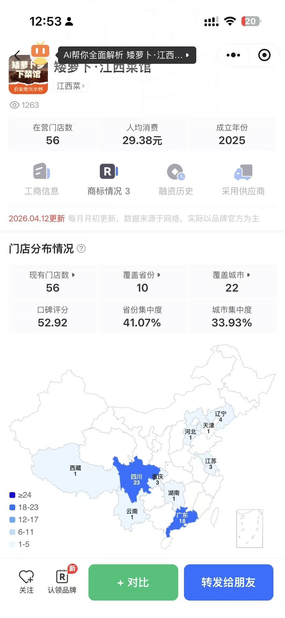 极目新闻记者注意到,矮萝卜·江西菜馆是一家连锁品牌。据餐饮品牌数据库“窄门餐眼”显示,矮萝卜·江西菜馆成立于2025年,人均消费29.38元,截至2026年4月12日,在全国范围内有56家门店,覆盖10个省份22个城市,其中广东有18家店铺,四川有23家店铺,选址以街边店和居民社区为主。记者尝试联系该品牌管理公司,但经多方查找,公开渠道没有检索到该品牌管理公司。