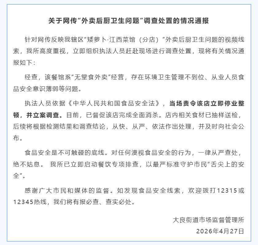 4月27日,广东佛山市顺德区大良街道市场监督管理所发布情况通报:针对网传反映我辖区“矮萝卜·江西菜馆(分店)”外卖后厨卫生问题的视频线索,我所高度重视,立即组织执法人员赶赴现场进行调查处置,经查,该餐馆系“无堂食外卖”经营,存在环境卫生管理不到位、从业人员食品安全意识薄弱等问题。
